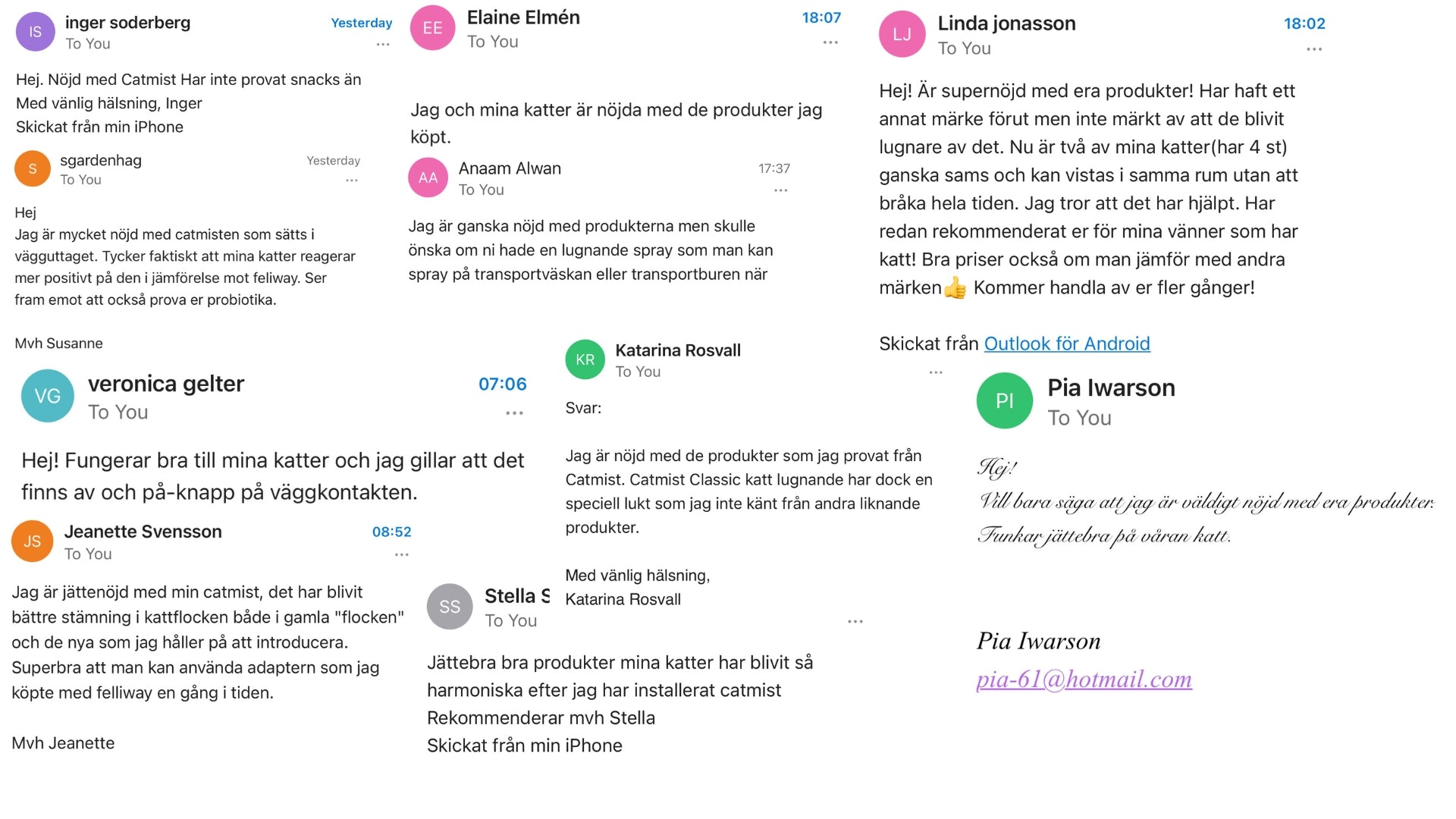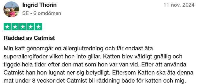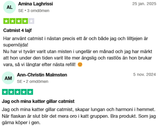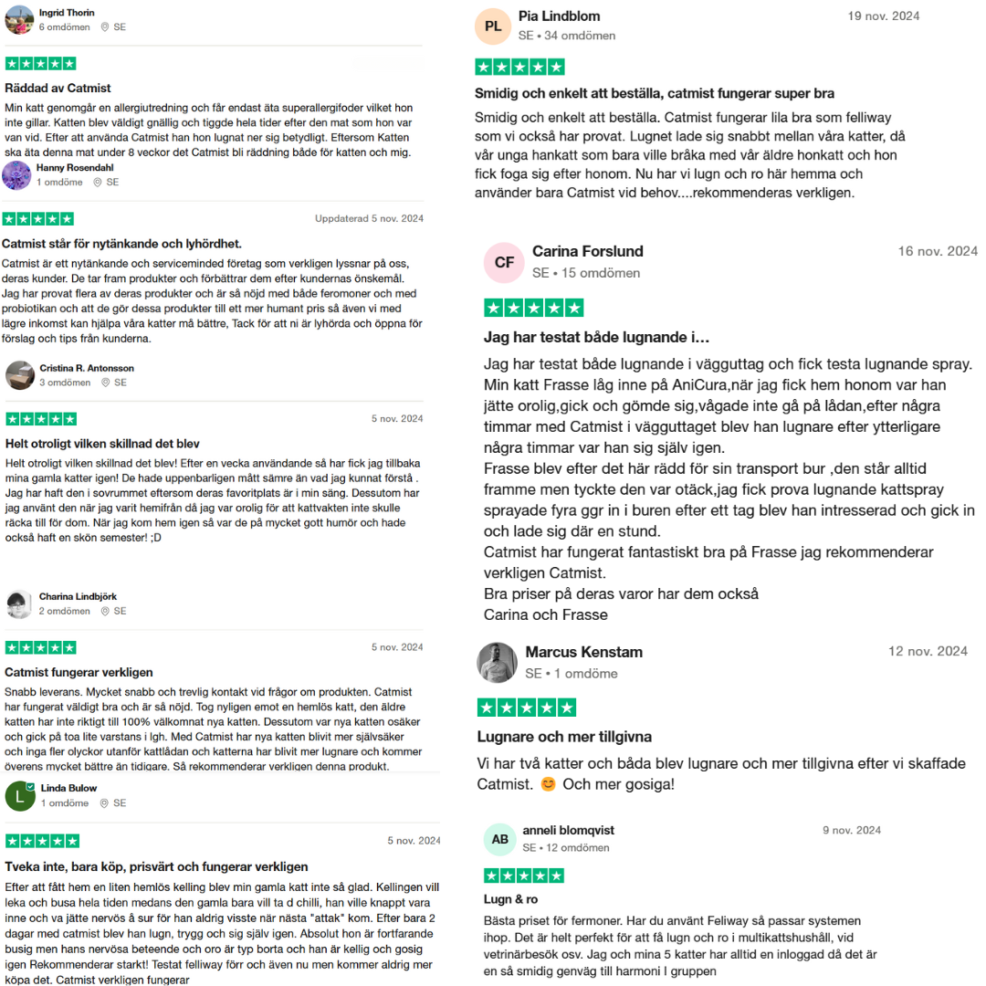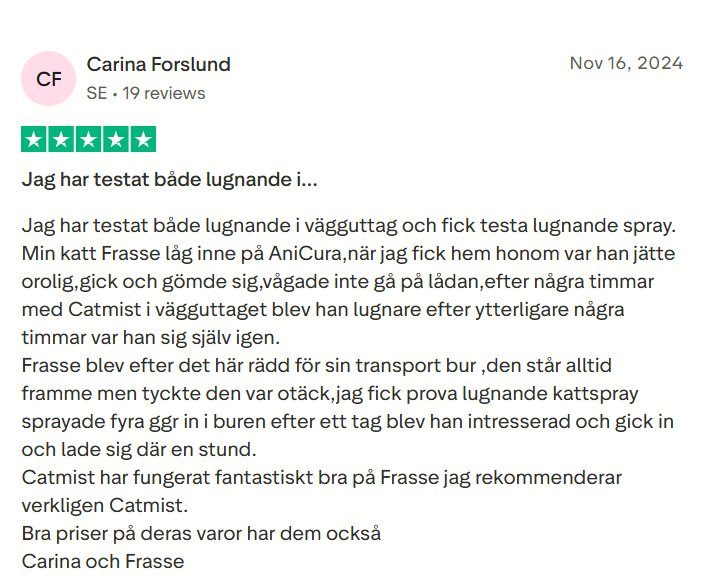 Fungerer godt, hvis ikke bedre end Feliway. Har en hunkat som har for vane at markere indendørs og nu er der gået en uge med Catmist og indtil videre - ingen markeringer! Derudover er Catmist væsentligt billigere.