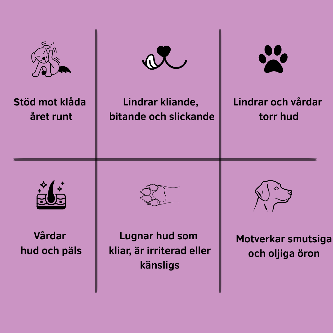 Här går vi igenom hur varje ingrediens hjälper till att lugna överdrivet kliande, slickande och tuggande.