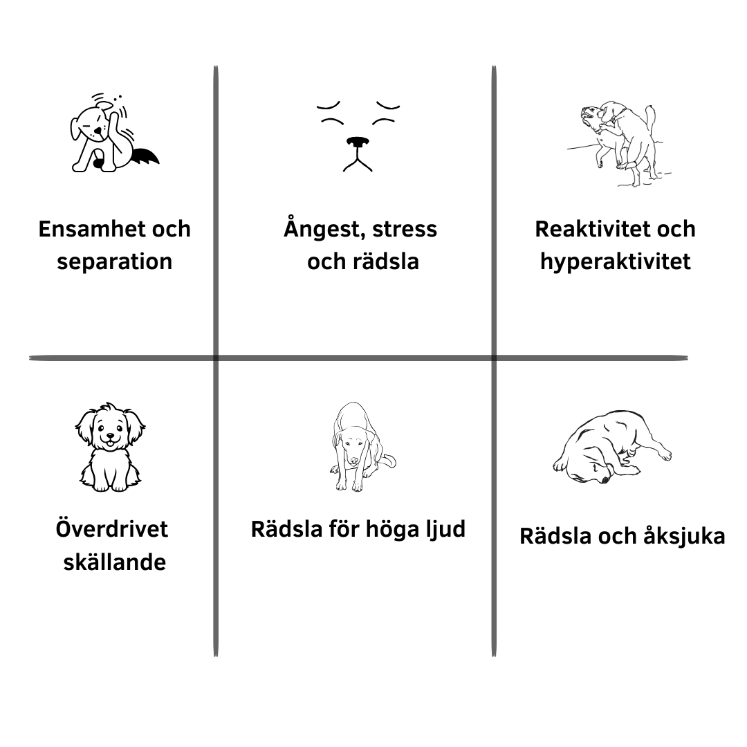 - Främjar avslappning, minskar stress och stödjer ett lugnt beteende hos hundar i stressiga situationer.